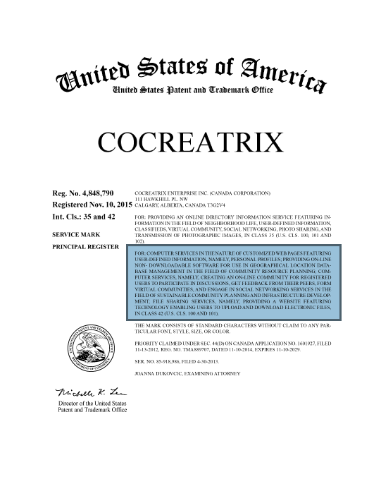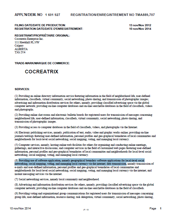 CO-CREATRIX Technology Services include: Electronic publishing services, namely, publication of text, audio, video and graphic works online; providing on-line journals /weblogs featuring user-defined information, personal profiles and geo-graphical boundaries of local communities and neighborhoods for local-level social networking, social mapping, voting, and managing local currency. Social networking services, namely local community and neighborhood. Advertising and information distribution services for others, namely, providing classified advertising space via the global computer network; providing on-line computer databases and online searchable databases in the field of classifieds. Providing voting and organizational group communications for registered users for transmission of messages concerning group life, user-defined information, resource sharing, task delegation, virtual community, social networking, photo sharing, and transmission of photographic images. see: Full List